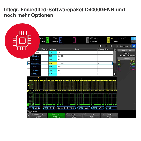 The oscilloscopes of the InfiniiVision 4000G series are available with bandwidths from 200 MHz to 1.5 GHz. You also have the choice between 2 or 4 channel DSO models as well as between 2+16 channel / 4+16 channel MSO models.