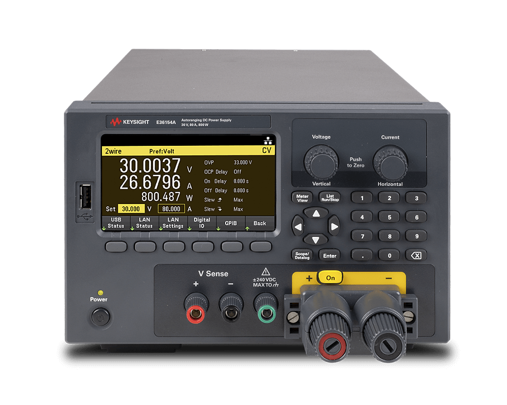 The Keysight E36154A is an autoranging DC power supply with 1 channel and has 800 W, 30 V, 80 A. The E36154A has a LAN and a USB interface as standard. A GPIB interface is optionally available. The E36154A includes advanced characterization tools such as data logging, an optional oscilloscope view, and an arbitrary function generator. This enables in-depth analysis and precise output modulation for a variety of applications, such as power simulation.