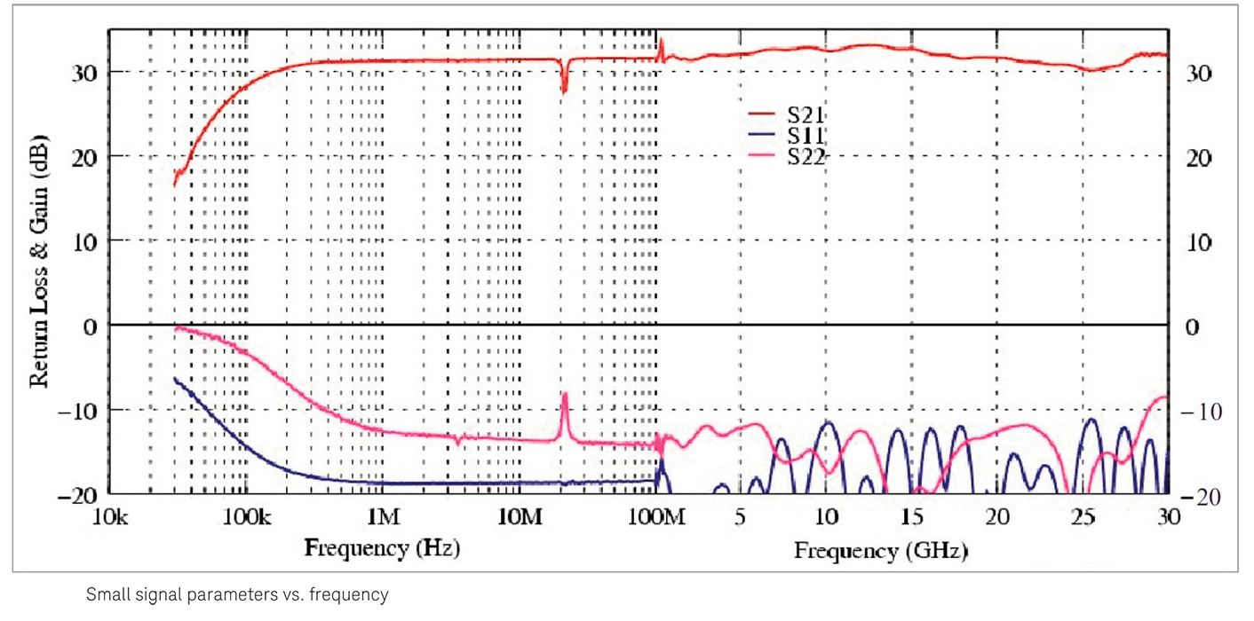 The N4985A-S30 system amplifier is a high performance, broadband amplifier featuring baseband RF (<100 kHz) through millimeter wave (> 30 GHz) frequency coverage. The amplifier is designed to be a multi-use laboratory RF amplifier as a gain block for frequency domain applications or as a time domain pulse amplifier. It's small size and versatile performance make it an excellent selection as a general purpose gain block with moderate power output in a single package potentially replacing 2 or 3 narrower band amplifiers.