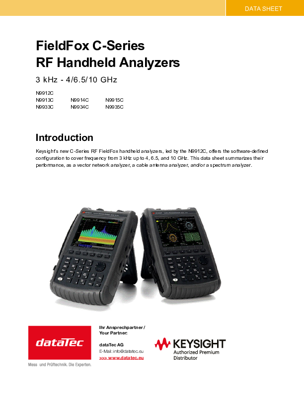 Compared to the other models in the FieldFox C series (N9913C, N9914C, N9915C), the N9912C is the most flexible basic model: It covers either 4, 6.5 or 10 GHz via software options and can be expanded both in frequency range and applications (CAT, VNA, SA, RTSA, etc.) can be expanded step by step. The N9913C, N9914C and N9915C models, on the other hand, are each designed for a fixed maximum frequency range (4 / 6.5 / 10 GHz) and therefore offer fewer options for subsequent adaptation. This makes the N9912C particularly suitable as a future-proof, freely configurable platform for individual upgrade concepts.