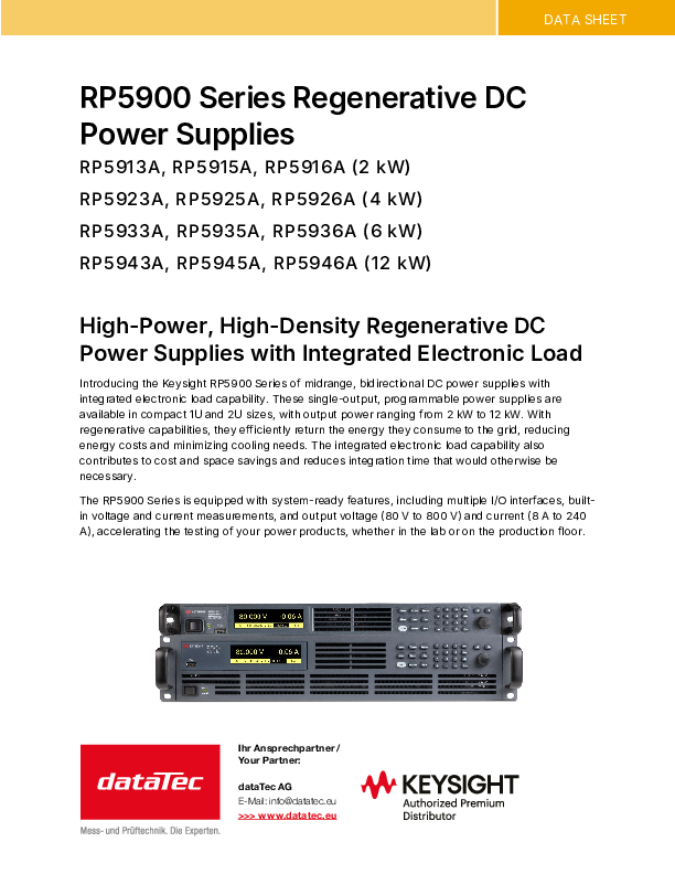 The RP5900 series is a powerful family of bidirectional DC power supplies with regenerative function. It combines high output power, flexible control and efficiency in a compact size. The devices offer an output of 2 kW to 12 kW per unit and can be connected in parallel to form systems with up to 96 kW. They support voltages up to 800 V and currents up to 240 A.