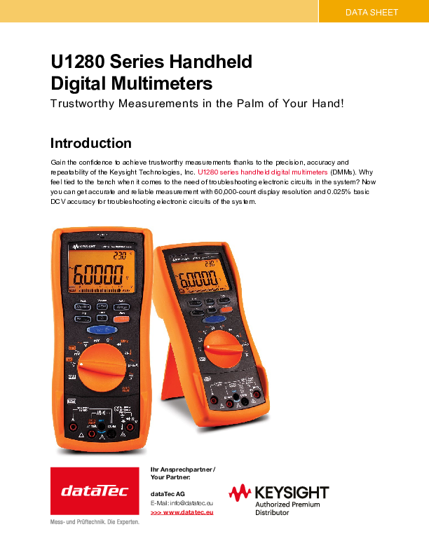 The U1280A series are very robust hand-held digital multimeters with measurement options that are typically required in industry. The series is certified to IP67 and can withstand a fall of approx. 3 m (10 feet). The battery life is 800 hours. In addition, this series offers unique data storage with the functions of corresponding measurement result protocols.
