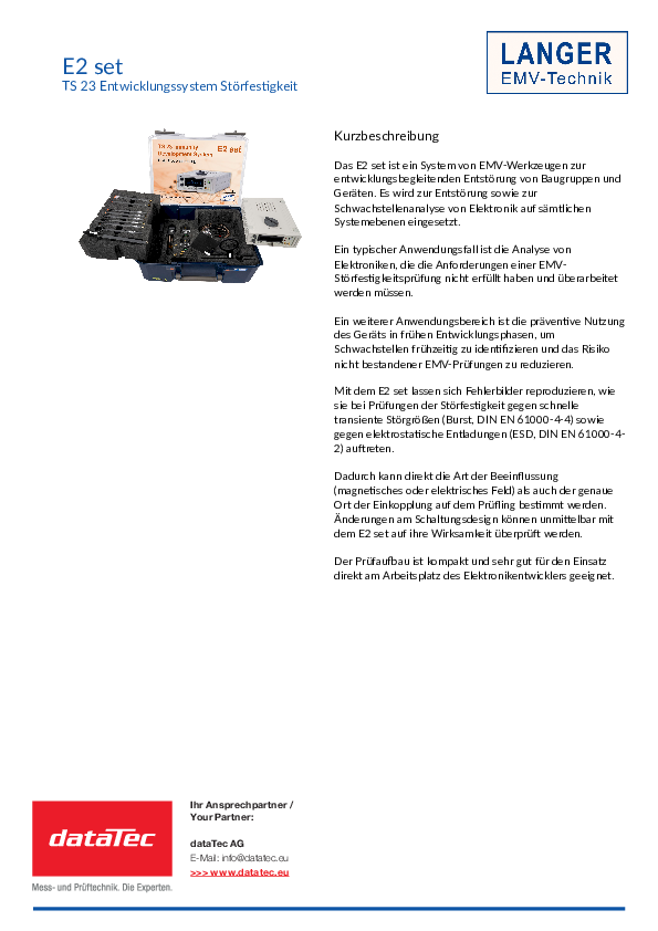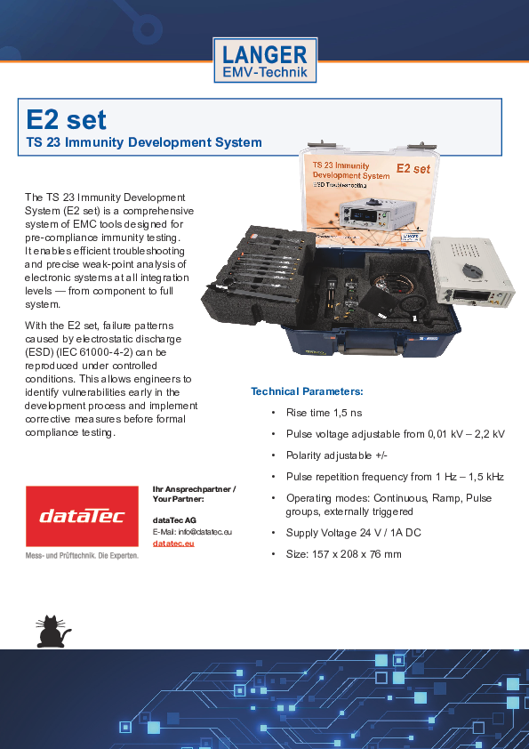 The E2 Set from Langer EMV-Technik is a comprehensive development system for the immunity analysis of electronic assemblies and systems. Specifically designed for pre-compliance immunity testing, it helps developers identify and resolve electromagnetic interference early on. Through the reproducible simulation of ESD-induced failure patterns under controlled conditions, the E2 Set enables efficient troubleshooting and precise vulnerability analysis at all integration levels – from individual assemblies to the complete system.
