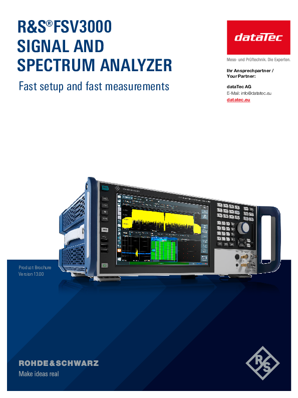 For demanding and fast signal analysis in the laboratory and in production: With the signal and spectrum analyzer FSV3004, even complex measurement applications can be configured quickly and easily, so that the measurement results are available to you in the shortest possible time. The RF parameters can be adjusted intuitively via a multi-touch display with a graphical user interface; the auto set function supports you in the automatic setting of the most important settings for frequency, level, etc. The SCPI recorder simplifies the test program development, and event-based actions help to debug rare signal appearances of a DUT.