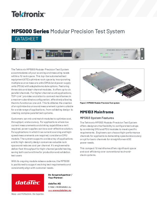 The Tektronix MP5000 series is a flexible and space-saving test system for research, development and production. With its modular design, it allows the combination of Source Measure Units (SMUs) and Power Supply Units (PSUs) in a 1 U rack housing. This achieves a high channel density at a low cost per channel - ideal for modern, automated test environments.