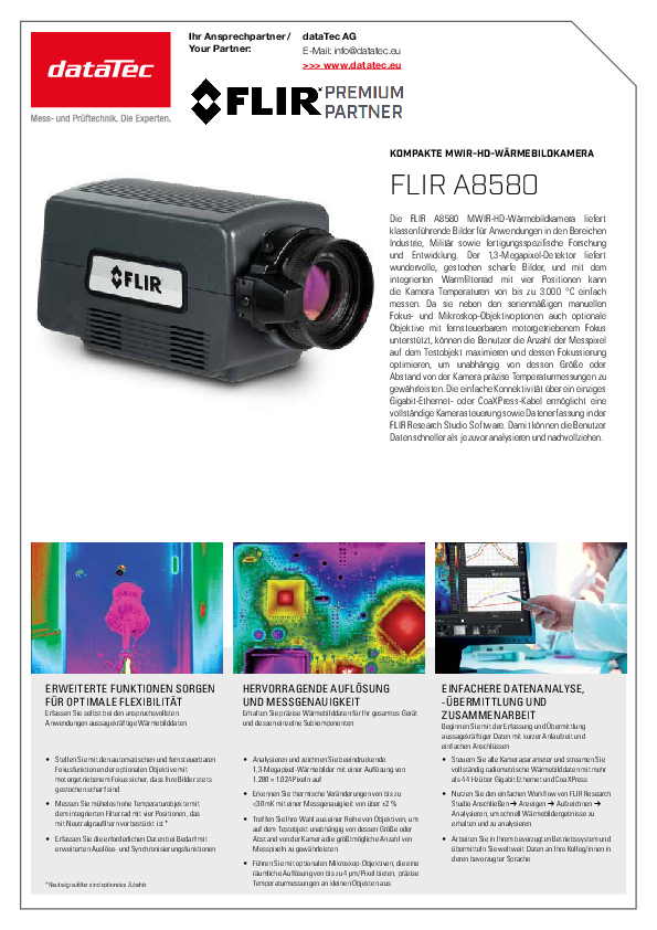 In addition to manual focus and microscope lens options, the A8581 also supports motorized focus lenses that allow for optimal focusing and maximum number of measurement pixels on the test object. Easy connectivity via Gigabit Ethernet or CoaXPress allows full camera control and data acquisition using FLIR Research Studio software, ensuring fast data analysis and processing.