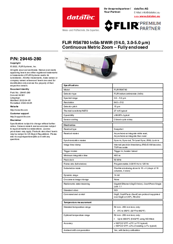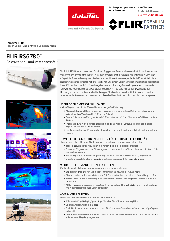 The Teledyne FLIR RS6780 InSb thermal imaging camera (3.0 - 5.0 µm, 640x512 px, 125 Hz) is specifically designed for demanding outdoor applications. It offers a robust design and high image quality to capture precise thermal images under extreme conditions.
