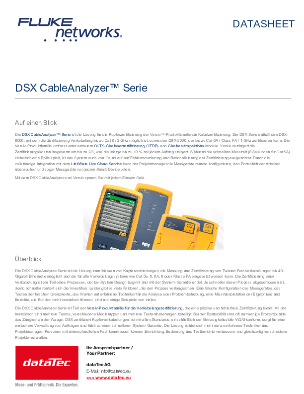 Die Kupferkabelzertifizierer der Fluke Networks DSX CableAnalyzer-Serie ermöglichen das Messen und Zertifizieren von Twisted Pair-Verkabelungen bis zu 40-Gigabit-LAN und können für alle Verkabelungssysteme wie Cat 5e, 6, 6A, 8 oder Klasse FA und I/II eingesetzt werden. Die Zertifizierung einer Verkabelung ist ein Teil eines Prozesses, der bei System-Design beginnt und mit der System-Herstellergarantie endet. Je schneller dieser Prozess abgeschlossen ist, desto schneller rentiert sich die Investition. Leider gibt es viele Faktoren, die den Prozess verlangsamen. Eine falsche Konfiguration des Messgerätes, das Testen der falschen Grenzwerte, das Warten auf erfahrene Techniker für die Analyse oder Problembehebung, eine Missinterpretation der Ergebnisse und Berichte, die Kunden nicht verstehen können, sind nur einige Beispiele von vielen.