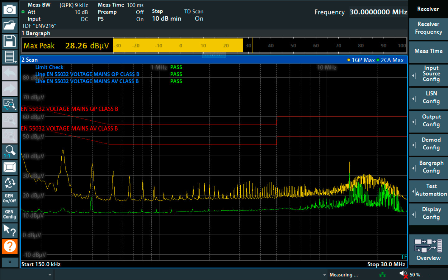 Die Automatisierung vereinfacht die Messungen und sorgt für eine exakte Reproduzierbarkeit der Prüfabläufe. So können zum Beispiel alle an einer Rohde&Schwarz Netznachbildung (LISN) angeschlossenen Leitungen auf Knopfdruck geprüft werden. Der Vergleich mit den konfigurierten Grenzwerten erfolgt ebenfalls automatisch, und der R&S EPL1000 zeigt das Ergebnis der gesamten Messung als PASS/FAIL an. Mit dem integrierten Reportgenerator lassen sich das Ergebnis und die Messdetails einfach speichern und ausdrucken.