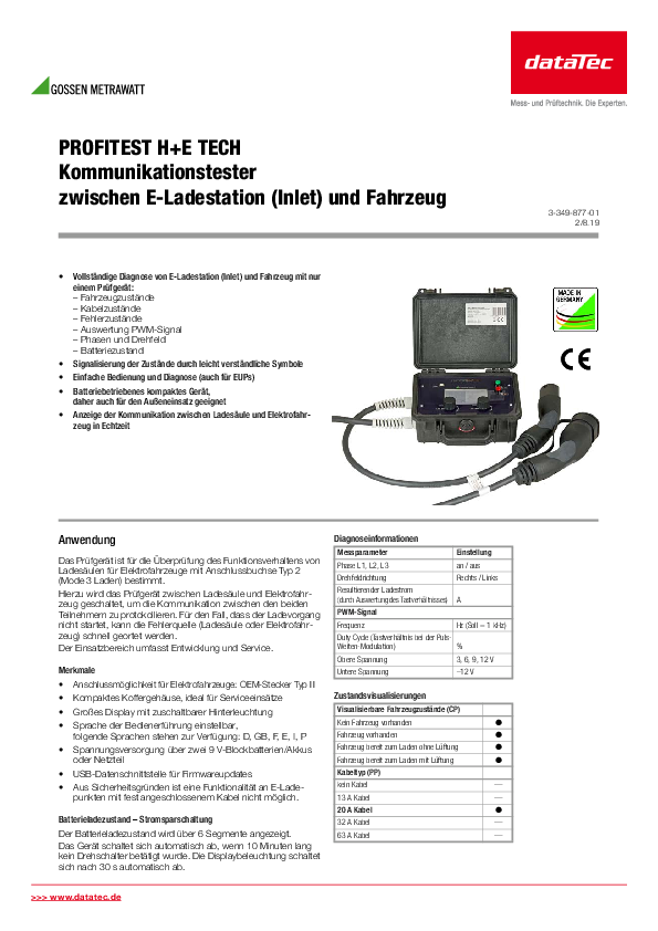 Hierzu wird das Prüfgerät zwischen Ladesäule und Elektrofahrzeug geschaltet, um die Kommunikation zwischen den beiden Teilnehmern zu protokollieren. Für den Fall, dass der Ladevorgang nicht startet, kann die Fehlerquelle (Ladesäule oder Elektrofahrzeug) schnell geortet werden. Der PROFITEST H+E TECH eignet sich für den Einsatzbereich in Entwicklung und Service.