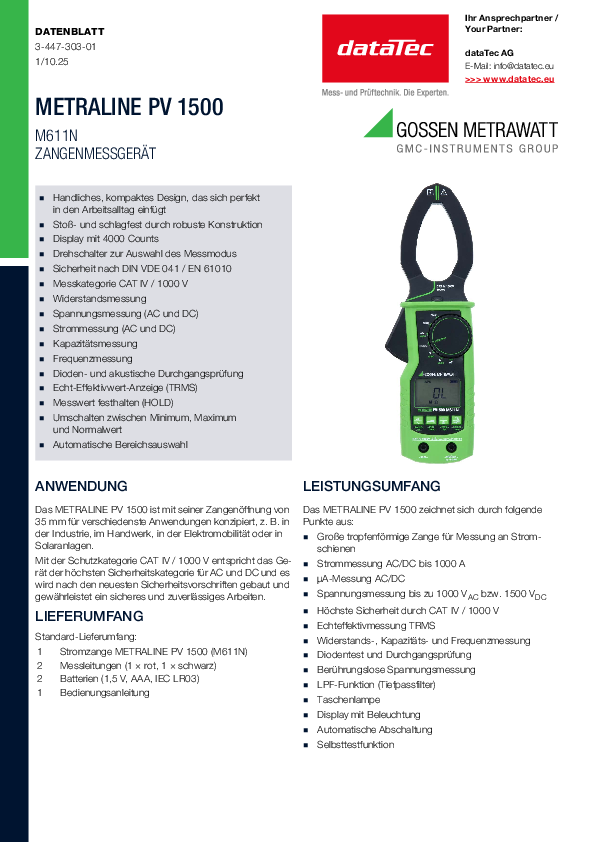 Das Gossen Metrawatt METRALINE PV 1500 ist ein robustes, handliches Zangenmessgerät für anspruchsvolle elektrische Messungen in Industrie, Handwerk, Elektromobilität und Photovoltaik. Dank großer, tropfenförmiger Zangenöffnung (35 mm) lassen sich auch Stromschienen und dicht gepackte Leitungen sicher umfassen. TrueRMS (TRMS) sorgt für präzise Ergebnisse bei verzerrten Signalen, während die Messkategorie CAT IV/1000 V höchste Sicherheit in rauen Umgebungen gewährleistet.