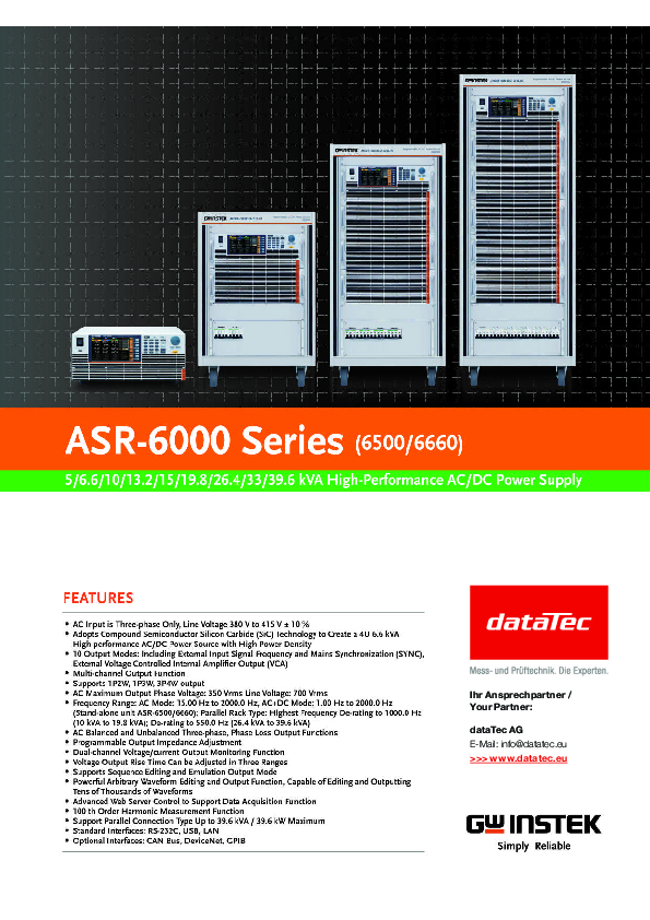 Die Serie ASR-6000 5kVA/6,6kVA von GW Instek ist eine leistungsstarke AC/DC-Stromversorgungsreihe, die speziell für anspruchsvolle Anwendungen entwickelt wurde, bei denen hohe Leistung, Stabilität und Flexibilität gefordert sind. Sie kombiniert modernste Siliziumkarbid-(SiC)-Halbleitertechnologie mit kompakter Bauweise (4U) und bietet eine hohe Leistungsdichte bis zu 6,6 kVA pro Gerät. Die Serie eignet sich ideal für den Einsatz in modernen Testumgebungen, Laboren und industriellen Prüfanwendungen, in denen variable Spannungs- und Frequenzbedingungen simuliert werden müssen.