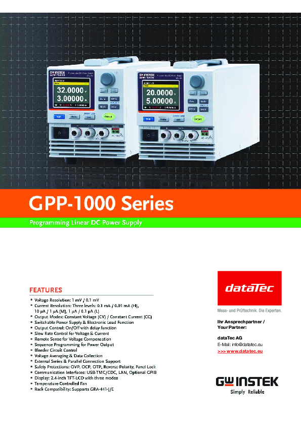 Die GPP-1000 Serie ist eine hochpräzise, programmierbare DC-Stromversorgung, die speziell für präzise Testanwendungen entwickelt wurde. Mit einer Auflösung von bis zu 1 mV / 0,1 mV bei der Spannung und drei Stufen der Stromauflösung bietet sie außergewöhnliche Genauigkeit. Die Geräte unterstützen sowohl den Constant Voltage (CV)- als auch den Constant Current (CC)-Betrieb und verfügen zusätzlich über eine umschaltbare Stromversorgung- und elektronische Last-Funktion.