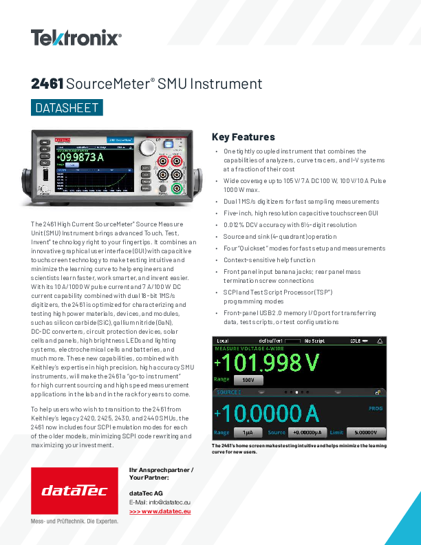 Das SMU-Instrument 2461 bietet Ihnen hochflexible Vier-Quadranten-Spannungs- und Stromquelle-/Lastfunktionen gekoppelt mit präziser Strom- und Spannungsmessung. So vereint 2461 die Anwendung als Präzisionsstromversorgung mit V- und I-Rückmeldung, als elektronische Präzisionslast, als Digitalmultimeter für DCV, DCI, Widerstand und Leistung mit 6½-stelliger Auflösung sowie als Triggersteuerung.