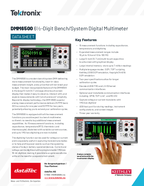 Das Gerät verfügt über einen hochgeschwindigkeits Digitalisierer mit 1 MS/s zur Erfassung von Spannungs- oder Stromwellenformen, was den Bedarf an zusätzlicher Ausrüstung eliminiert. Mit seiner fortschrittlichen DCV-Genauigkeit von 25 PPM für ein Jahr können Sie Ihre Kalibrierintervalle verlängern und die Produktivität optimieren. Ausgestattet mit Standard USB-TMC, LXI/Ethernet-Schnittstellen sowie optionalen GPIB und RS-232 Modulen passt sich der DMM6500 nahtlos an verschiedene Messumgebungen an.
