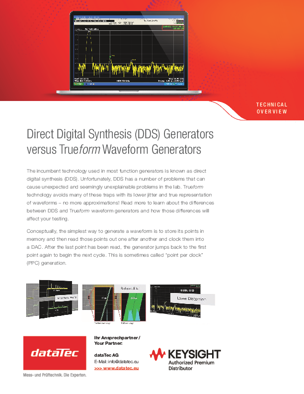 Keysight (vormals Agilents elektronische Messtechnik) Trueform Technologie ist die nächste Generation in Generierung von Signalen und bietet eine überlegene Leistung im Vergleich zu früheren Signalform -Technologien. Trueform Technologie bietet die geringsten Jitter und niedrigsten Klirrfaktor, um die Ergebnisse Ihrer schwierigsten Messungen zu verbessern. Die Generatoren der Familie 33500B bieten Ihnen die Funktionsausstattung, Signalreinheit und Flexibilität, die Sie zur verlässlichen Charakterisierung Ihrer Komponenten und Designs benötigen.