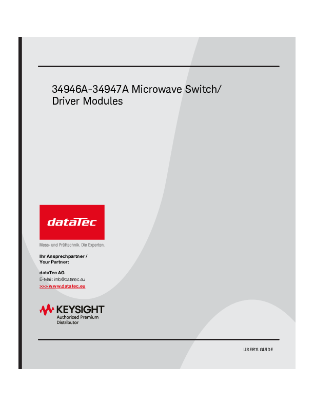 Das Modul 34947A ist ein Mikrowellen-Schalter für das Keysight 34980A Grundgerät. Es ermöglicht bidirektionales Schalten von Signalen mit einer Bandbreite von DC bis 26,5 GHz. Diese Schalter zeichnen sich durch exzellente Spezifikationen für die Einfügedämpfung und für das Spannungs-Stehwellenverhältnis aus. Das Modul enthält drei voneinander unabhängige Mikrowellenschalter, die als 1x2 Wechselschalter ausgeführt sind. Für allgemeine Anwendungen sind diese Mikrowellenschalter z. B. geeignet unterschiedliche Signalquellen auf einen Eingang eines zu testenden Moduls (DUT / Device Under Test) wie Empfänger, Übertrager oder Umsetzer zu schalten.