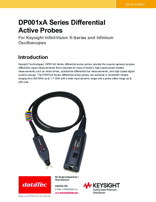 Die aktiven Differenzialtastköpfe der Serie DP001xA von Keysight Technologies bieten überragende Allzweck-Differenzialsignalmessungen, die für viele der heutigen Hochgeschwindigkeits-Leistungsmessungen erforderlich sind, z. B. für Motorantriebe, Differenzialbusmessungen in der Automobilindustrie und die Entwicklung digitaler Hochgeschwindigkeitssysteme. Die aktiven Differenztastköpfe der Serie DP001xA sind in Bandbreiten von 250 MHz bis 1,7 GHz mit einem großen Eingangsdynamikbereich und einem Tastkopf-Offsetbereich von bis zu ±60 Volt verfügbar.