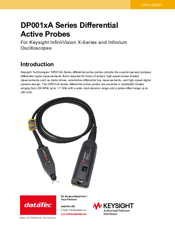 Die aktiven Differenzialtastköpfe der Serie DP001xA von Keysight Technologies bieten überragende Allzweck-Differenzialsignalmessungen, die für viele der heutigen Hochgeschwindigkeits-Leistungsmessungen erforderlich sind, z. B. für Motorantriebe, Differenzialbusmessungen in der Automobilindustrie und die Entwicklung digitaler Hochgeschwindigkeitssysteme. Die aktiven Differenztastköpfe der Serie DP001xA sind in Bandbreiten von 250 MHz bis 1,7 GHz mit einem großen Eingangsdynamikbereich und einem Tastkopf-Offsetbereich von bis zu ±60 Volt verfügbar.