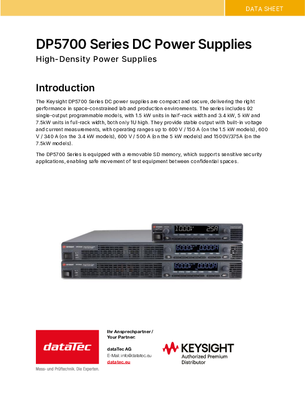 Die DP5700 Serie ist eine moderne Familie kompakter DC-Netzgeräte, konzipiert für den Einsatz in automatisierten Testsystemen (ATE) und Laborumgebungen mit hohen Anforderungen an Genauigkeit, Dynamik und Effizienz. Sie deckt einen Leistungsbereich von 1,5 kW bis 5 kW ab und bietet Spannungen bis 600 V bei Strömen bis 500 A – in platzsparender 1U-Bauhöhe als Half- oder Full-Rack-Variante.