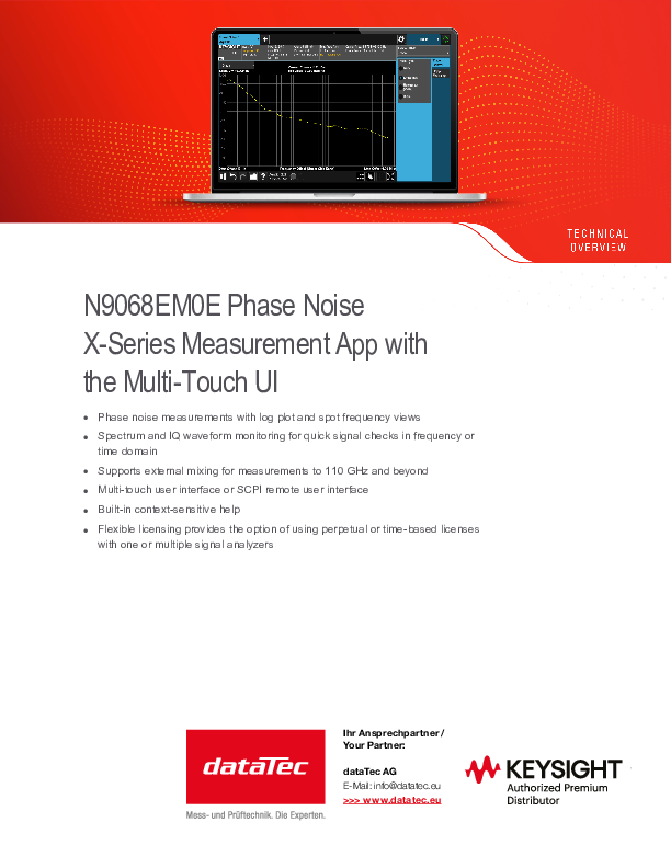 The N9068EM0E phase noise measurement application provides phase noise testers in frequency and time domain analysis with multi-touch screen operation for the Keysight N9040B UXA signal analyzer. Transforming the UXA signal analyzer into a phase noise tester with the intuitive multi-touch operation, automating the measurement procedure.