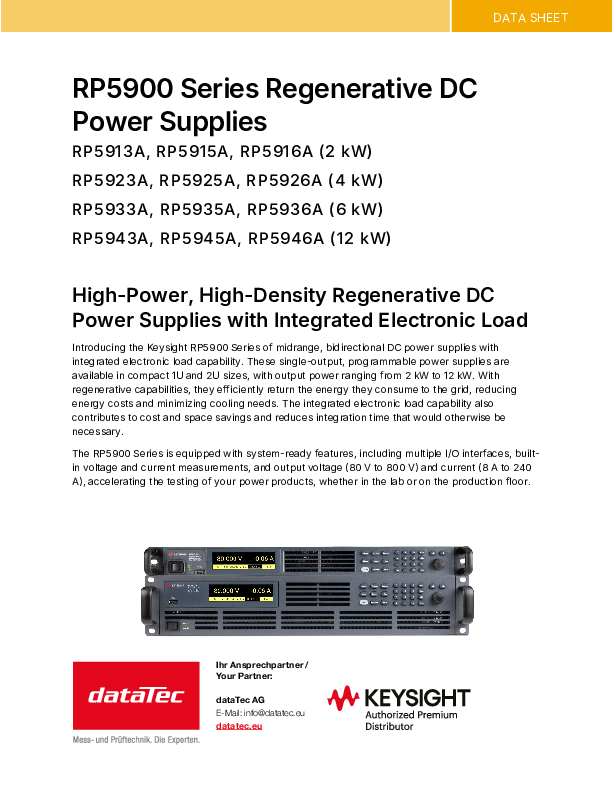 Die RP5900-Serie ist eine leistungsstarke Familie bidirektionaler DC-Stromversorgungen mit Rückspeisefunktion. Sie kombiniert hohe Ausgangsleistung, flexible Steuerung und Effizienz bei kompakter Baugröße. Die Geräte bieten eine Leistung von 2 kW bis 12 kW pro Einheit und lassen sich zu Systemen mit bis zu 96 kW parallel verschalten. Sie unterstützen Spannungen bis 800 V und Ströme bis 240 A.