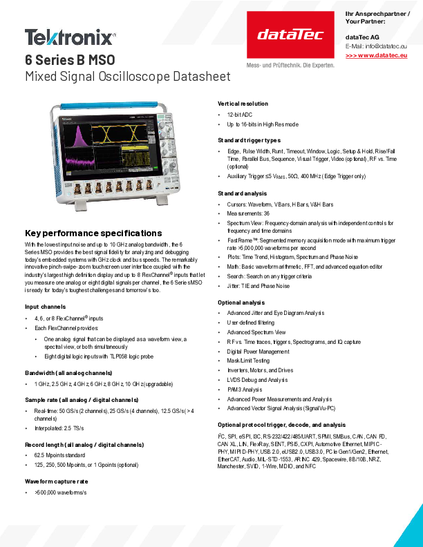 Fehlerbehebung und Validierung von Highspeed-Designs, Maskentest, serielle Protokoll-Triggerung und -Analyse, erweiterte Jitter-Analyse oder Compliance-Test für serielle Busse: mit dem Mixed Signal Oszilloskop der Serie 6 B sind Sie für heutige und zukünftige Messanwendungen gerüstet – mit einer erweiterbaren Bandbreite von 1 bis 10 GHz, vielseitigen und präzisen Messfunktionen und einer Abtastrate von 50 GSa/s.
