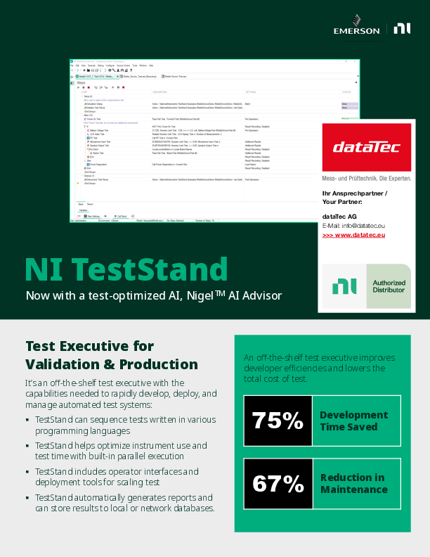 NI (National Instruments) TestStand ist eine Software für das Testmanagement, die Ihnen dabei hilft, Testsysteme zu entwickeln und bereitzustellen sowie Fehler zu beheben. Dabei erhalten Sie stets vollen Einblick in den Testprozess und die Ergebnisse. - Die Entwicklungsumgebung TestStand unterstützt Ingenieure bei der schnellen Entwickelung robuster automatisierter Prüf- und Validierungssysteme. Die Funktionalität von Systemen lässt sich durch Entwickeln von Testsequenzen in TestStand erweitern. Die Testsequenzen integrieren auch Codemodule, die in anderen Programmiersprachen geschrieben wurden. Sie können den eingebauten Funktionsumfang dazu nutzen, Geschwindigkeit und parallele Ausführung zu optimieren, bevor Sie Testsysteme für die Produktion bereitstellen. TestStand umfasst erweiterbare Plug-ins zum Erstellen von Protokollen, Protokollieren in Datenbanken und zum Einbinden anderer Systeme, sodass den Anforderungen jeder Umgebung Genüge getan wird. Mit TestStand können Sie bedenkenlos Prüfsysteme mit erhöhtem Durchsatz bereitstellen, die mit Produktionsgeschwindigkeit laufen.