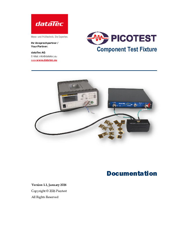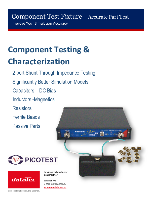 Das Picotest Component Test Fixture (CTF) ist ein leistungsstarkes Test-Fixture zur schnellen und hochpräzisen Impedanz- und S-Parameter-Messung von SMD-Bauelementen. Dank der Kombination aus präzisem Fixture-Design, speziellen Kalibratoren und abgestimmten Test-Mounts ermöglicht das CTF Messungen bis in den Bereich von pH und pF und unterstützt so eine deutlich höhere Modellgüte als reine Datenblattannahmen.