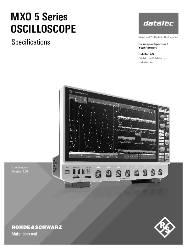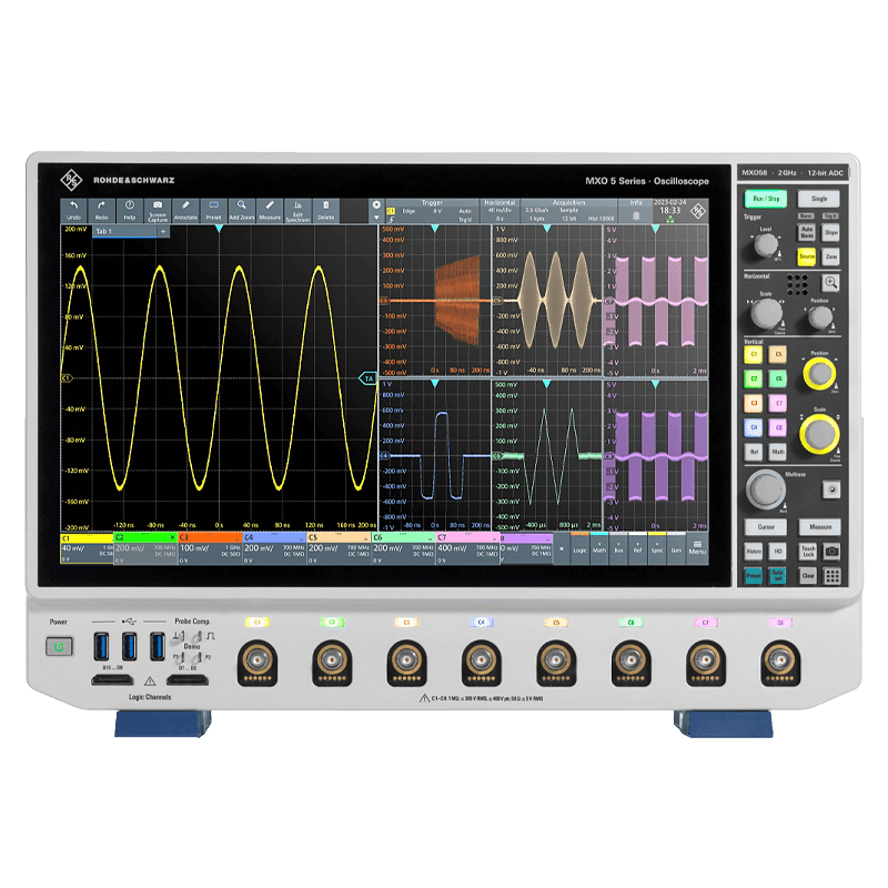 Die Oszilloskope der Rohde & Schwarz MXO 5 Serie bieten branchenführende Technologie, die Ihr Verständnis und die Prüfung elektronischer Systeme beschleunigt. Die MXO 5 Serie umfasst sowohl 4- als auch 8-Kanal Modelle mit Bandbreiten von bis zu 2 GHz, einer maximalen Samplingrate von bis zu 5 GSa/s, eine Erfassungsrate von bis zu 4,5 Mwfm/s sowie eine vertikale Auflösung von 12 bit ADC (18 bit im HD Modus).