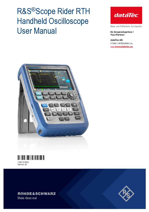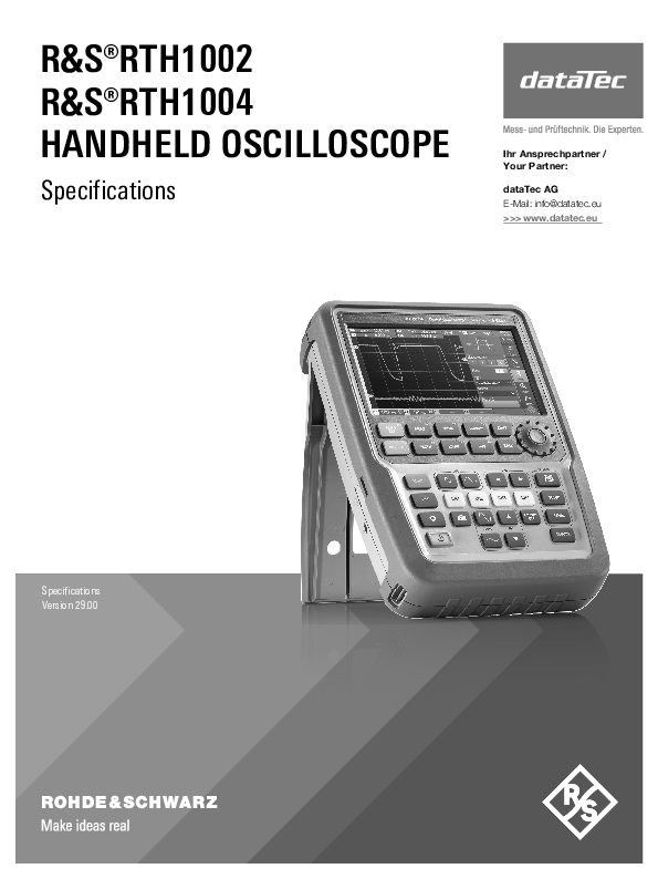 Leistungsfähigste und technisch überlegene Handheld-Oszilloskope der R&S®Scope Rider-Serie für Laboreinsatz (Lab) und mobile Anwendungen (Field). Technisch überlegen dank einem 10-bit-A/D-Wandler, einfach in der Bedienung über Touch Panel, sicher im Einsatz dank CAT IV, unabhängig unterwegs mit mehr als 4 Stunden Batterielaufzeit – das sind nur einige Eigenschaften dieses bislang einzigartigem Oszilloskops. Zudem besteht das RTH aus bis zu 5 Geräten (je nach Modell) in einem kompakten Format: Labor-Oszilloskop, Logikanalysator, Protokollanalysator, Datenlogger und digitales Multimeter.