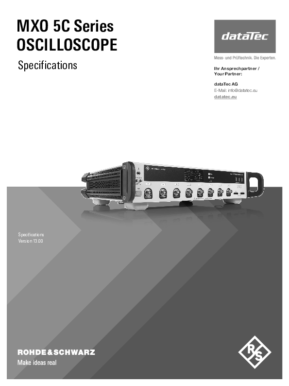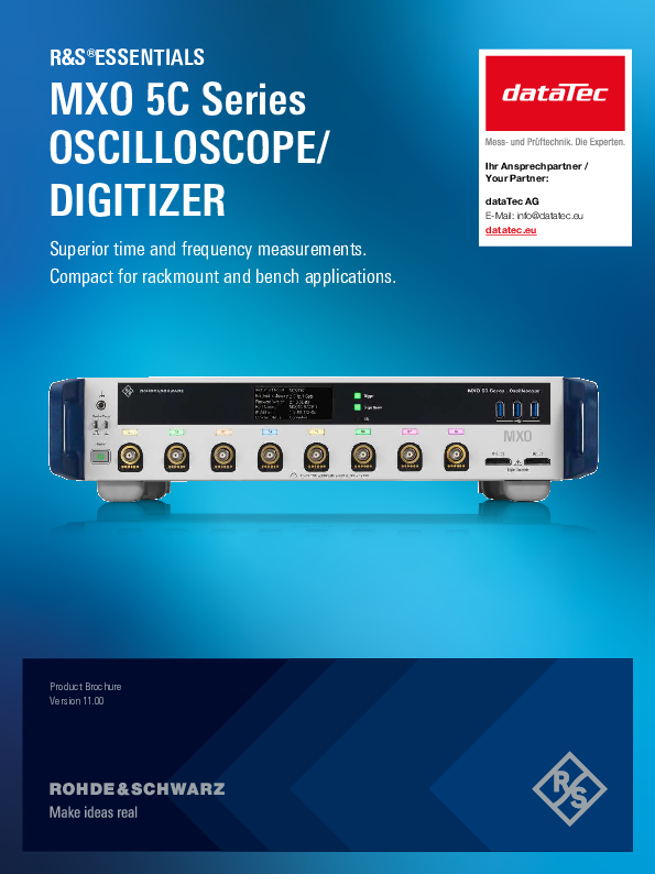 Die kompakten Oszilloskope der Rohde & Schwarz MXO 5 C Serie bieten branchenführende Technologie, die Ihr Verständnis und die Prüfung elektronischer Systeme beschleunigt. Die MXO 5 C Serie ist technisch identisch mit den erfolgreichen und bewährten Rohde & Schwarz MXO5 Oszilloskopen. Durch ihre kompakte Bauweise mit lediglich 2 HE lassen sich die Oszilloskope der MXO5C Serie hervorragend in Racks einbauen oder aufeinander stapeln. Die MXO5C Serie umfasst sowohl 4- als auch 8-Kanal Modelle mit Bandbreiten von bis zu 2 GHz, einer maximalen Samplingrate von bis zu 5 GSa/s, eine Erfassungsrate von bis zu 4,5 Mwfm/s sowie eine vertikale Auflösung von 12 bit ADC (18 bit im HD Modus).
