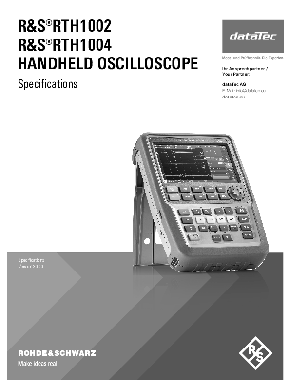 Leistungsfähigste und technisch überlegene Handheld-Oszilloskope der Rohde & Schwarz Scope Rider-Serie für Laboreinsatz (Lab) und mobile Anwendungen (Field). Technisch überlegen dank einem 10-bit-A/D-Wandler, einfach in der Bedienung über Touch Panel, sicher im Einsatz dank CAT IV, unabhängig unterwegs mit mehr als 4 Stunden Batterielaufzeit – das sind nur einige Eigenschaften dieses bislang einzigartigem Oszilloskops. Zudem besteht das RTH aus bis zu 5 Geräten in einem kompakten Format: Labor-Oszilloskop, Logikanalysator, Protokollanalysator, Datenlogger und digitales Multimeter.