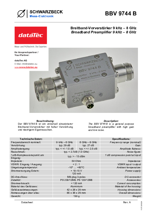 Der Schwarzbeck BBV 9744 B ist ein kompakter und leistungsstarker Breitband-Vorverstärker, der Frequenzen von 9 kHz bis 8 GHz abdeckt. Mit einer hohen Verstärkung von bis zu 29 dB und einem niedrigen Eigenrauschen (< 2,7 dB) eignet er sich besonders für Anwendungen, die hohe Signalempfindlichkeit erfordern, wie etwa Messungen mit niedrigen Grenzwerten.