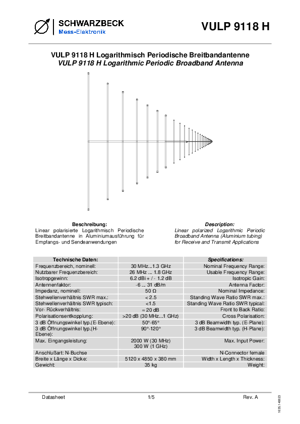 Die VULP 9118 H ist eine linear polarisierte, logarithmisch-periodische Breitbandantenne aus Aluminium für Sende- und Empfangsanwendungen. Mit ihrem außergewöhnlich großen Frequenzbereich, hohem Gewinn und hoher Leistungsaufnahme eignet sie sich besonders für EMV-Prüfungen, Feldstärkeerzeugung und professionelle Messaufbauten im Fernfeld.