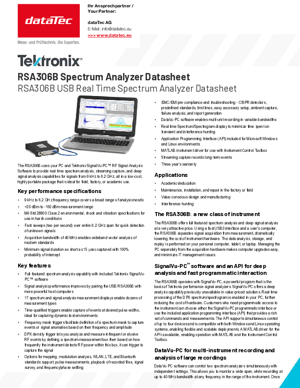 Durch Nutzung des PCs und der HF-Signalanalyse-Software SignalVu-PC™ von Tektronix können mit dem RSA306B Funktionen wie Echtzeit-Spektrumanalyse, Streaming-Erfassung und tiefgehende Signalanalyse bei Signalen von 9 kHz bis 6,2 GHz durchgeführt werden – und dies alles in einem kostengünstigen, leicht transportierbaren Gerät, das ideal geeignet ist für den Einsatz vor Ort bei der Instandhaltung, Installation und Reparatur im Werk oder für Lehr- und Lernzwecke im akademischem Bereich / Ausbildung.