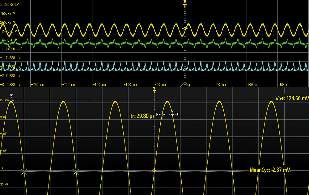 Mit einem Oszilloskop lassen sich Signale in einem zeitlichen Zusammenhang darstellen. Triggerbedingungen bestimmen die Aufzeichnung und Darstellung der Signale. Die zweidimensionale Anzeige gibt in der y-Achse die Signalamplituden wieder, während die x-Achse den Zeitverlauf darstellt.